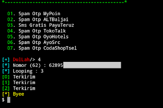 Spam Termux ini bertindak dengan cara mengirimkan sebuah pesan SMS yang berisi Kode OTP, maka dari itu Spam SMS Termux ini di sebut juga dengan Spam OTP Termux. Anda dapat mengirimkan nya ke banyak nomor telepon milik target anda dalam sekali Klik.
